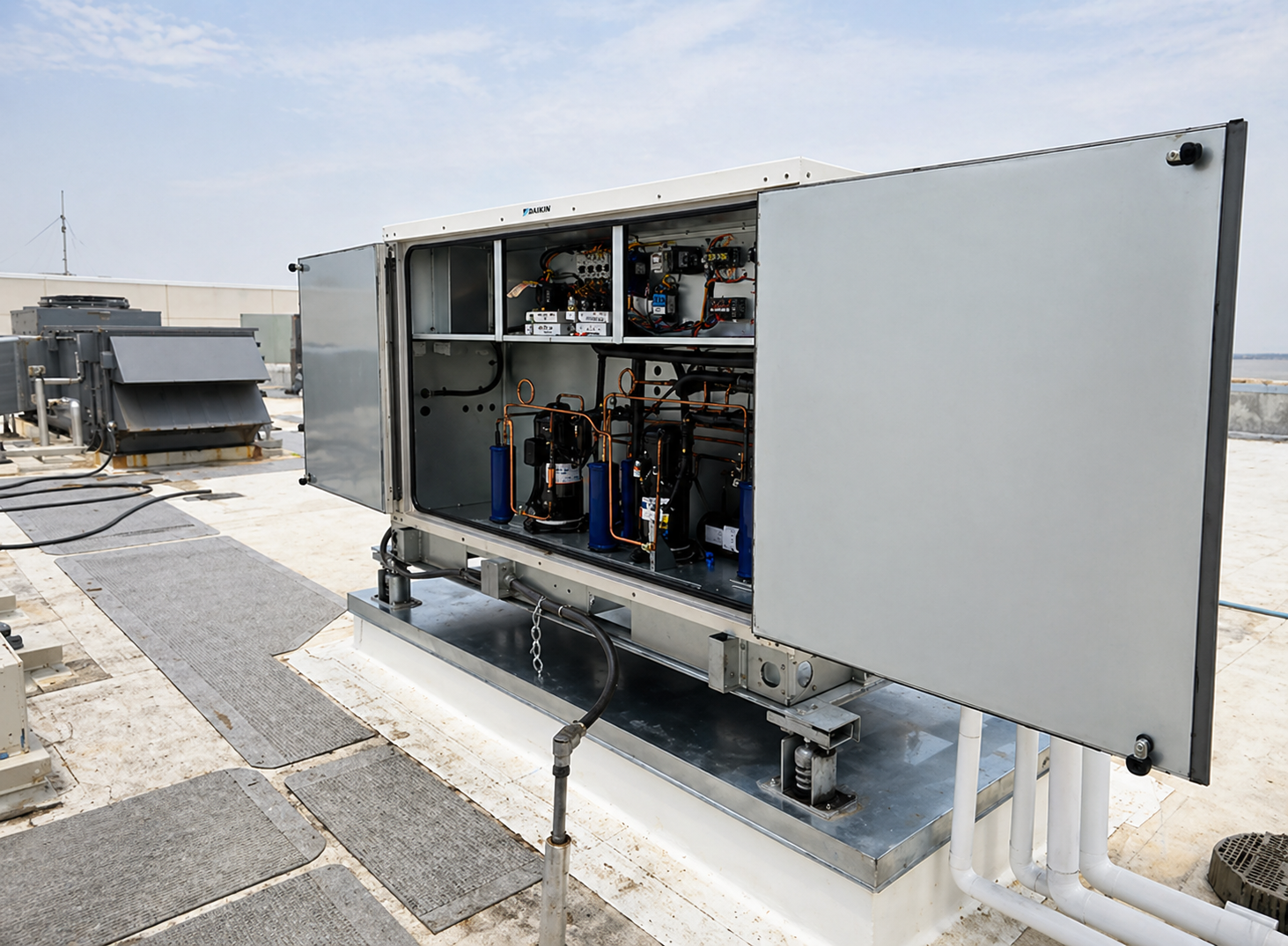 Replacement of rooftop mechanical systems at Skyline College, including exhaust fans, sound attenuators, condensing units, and associated DX coils across two campus buildings. The work focused on upgrading aging infrastructure to improve system performance and reliability.
